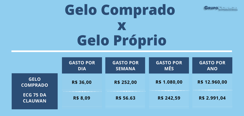 Gelo próprio: primeiro, é preciso escolher o modelo da sua maquina de gelo. Para efeito comparativo, vamos supor que você optou pela ECG 75 da Clauwan. Ela pode produzir até 75kg de gelo diariamente, o custo seria de R$ 0,11 por quilo – menos de R$ 1. Considerando a média nacional de custos com tarifas de água e energia, você gastaria R$ 8,09 por dia, o que daria R$ 56.63 por semana. No fim do mês, o valor seria de R$ 242,59 e, em um ano, chegaria a R$ 2.991,04.